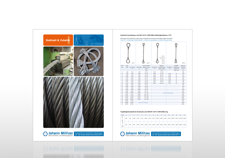 Konzept, Fotografie und Gestaltung eines 96-seitigen Produktkatalogs im Format DIN A4, Ansicht: Exemplarische Doppelseite, Kunde: Johann Militzer – Kölner Drahtseil- und Hebezeugtechnik