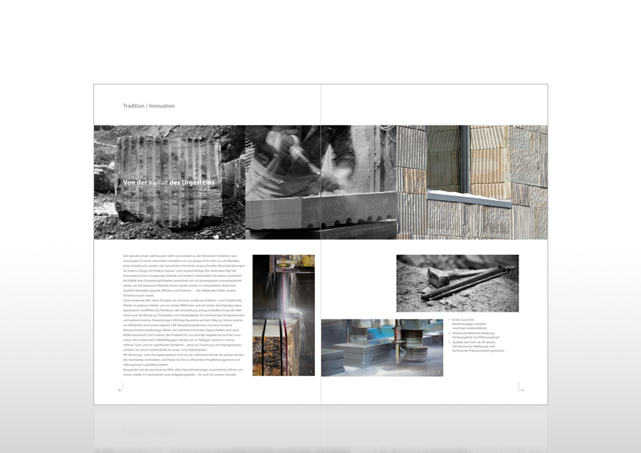 Gestaltung einer 22-seitigen Imagebroschüre, Ansicht: Doppelseite 08/09, Kunde: Quirrenbach – Innovation Naturgestein