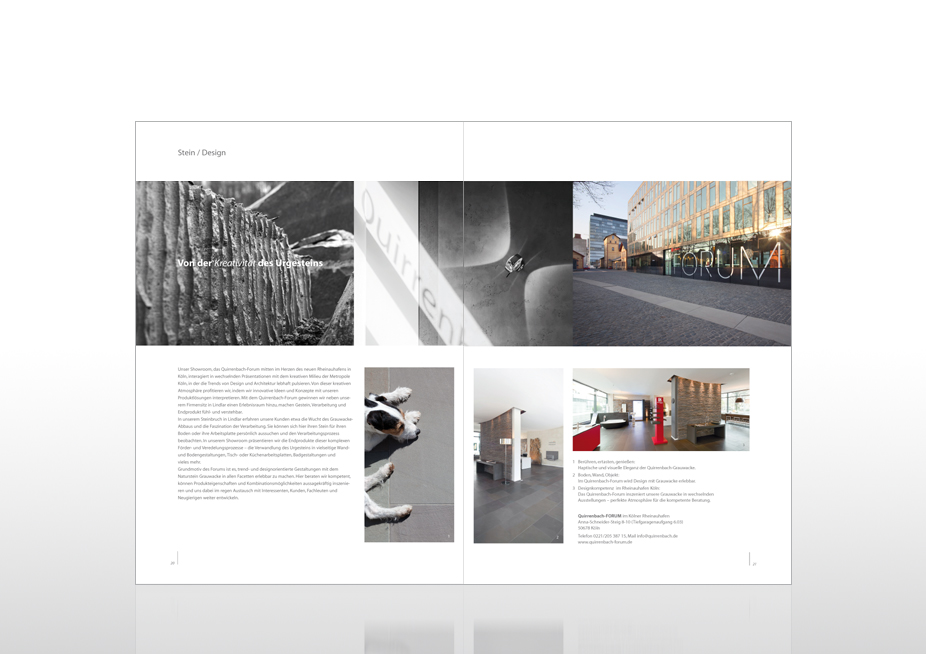 Gestaltung einer 22-seitigen Imagebroschüre, Ansicht: Doppelseite 20/21, Kunde: Quirrenbach – Innovation Naturgestein