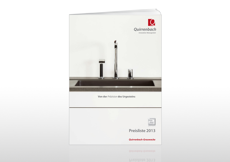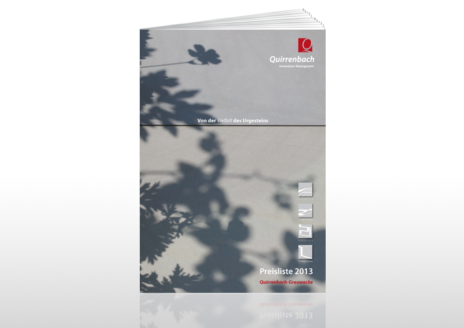 Konzept und Gestaltung einer 24-seitigen Preisbroschüre mit differenzierten Tabellendarstellungen, Ansicht: Titelseite, Kunde: Quirrenbach – Innovation Naturgestein