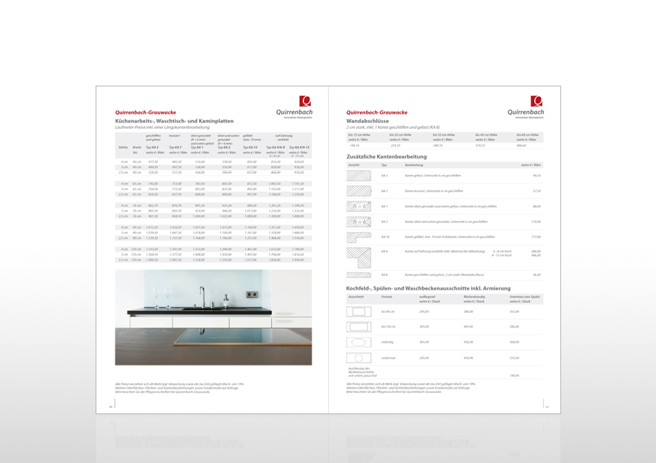 Konzept und Gestaltung einer 14-seitigen Preisbroschüre mit differenzierten Tabellendarstellungen, Ansicht: Doppelseite 06/07, Kunde: Quirrenbach – Innovation Naturgestein