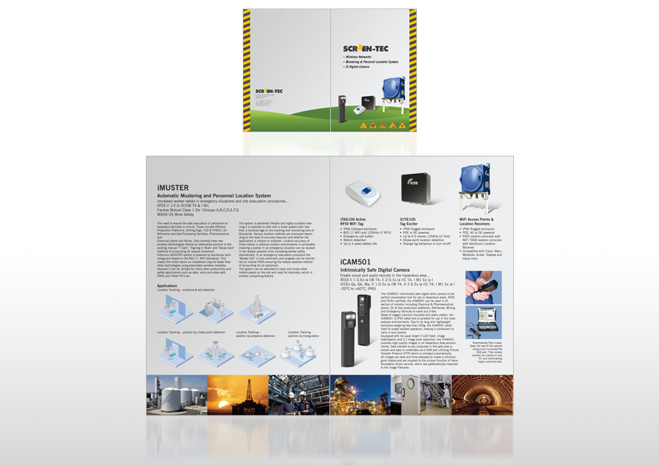 Gestaltung einer 4-seitigen, englischsprachigen Broschüre, Ansicht: Innenseiten (groß) + Rücktitel/Titel (klein), Kunde: Screen-Tec GmbH (inzwischen zugehörig zu Stahl-HMI Systems GmbH)
