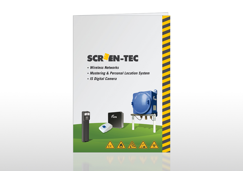 Gestaltung einer 4-seitigen, englischsprachigen Broschüre, Ansicht: Titelseite, Kunde: Screen-Tec GmbH (inzwischen zugehörig zu Stahl-HMI Systems GmbH)