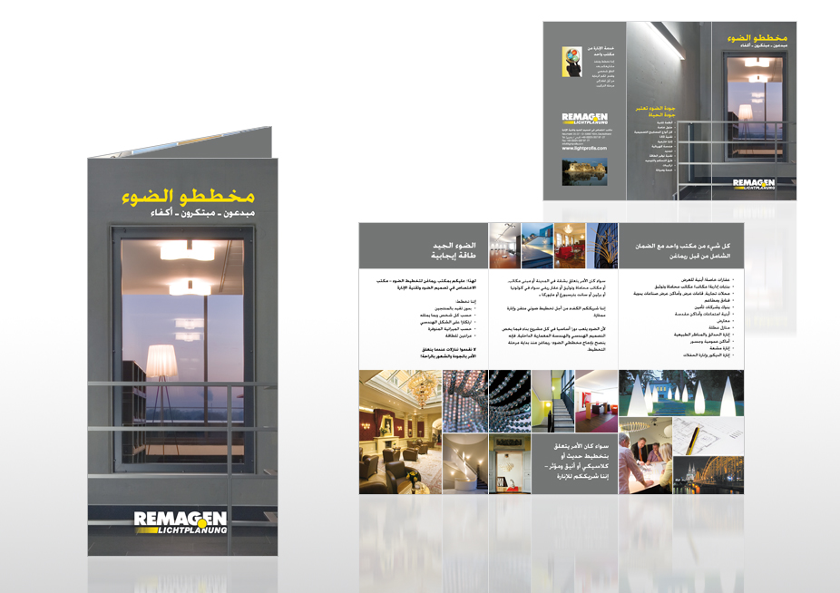 Redaktion und Gestaltung eines 6-seitigen DIN-lang Leporellos in 7 verschiedenen Sprachen, Kunde: Remagen Lichtplanung