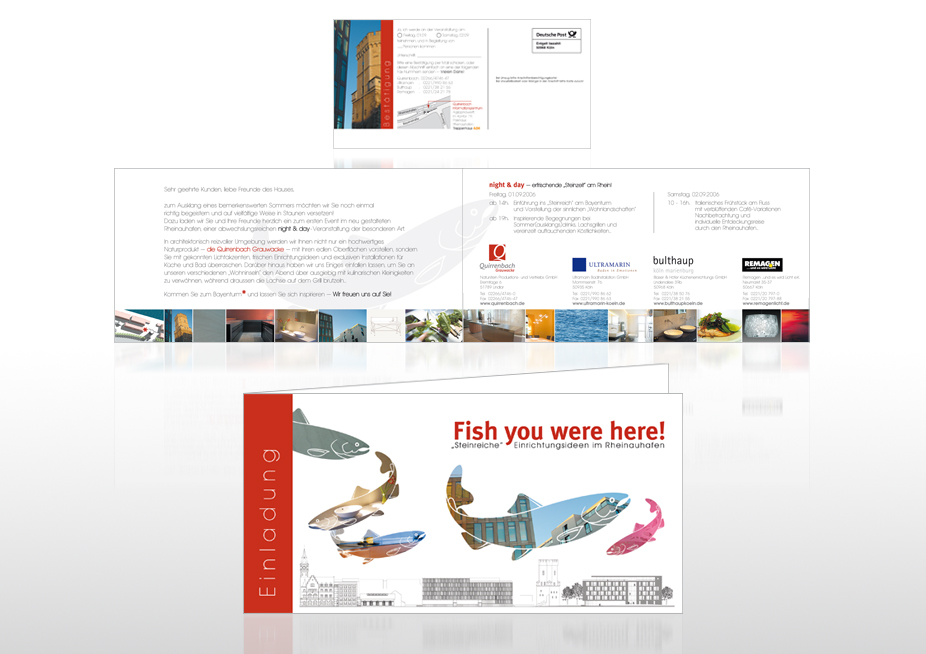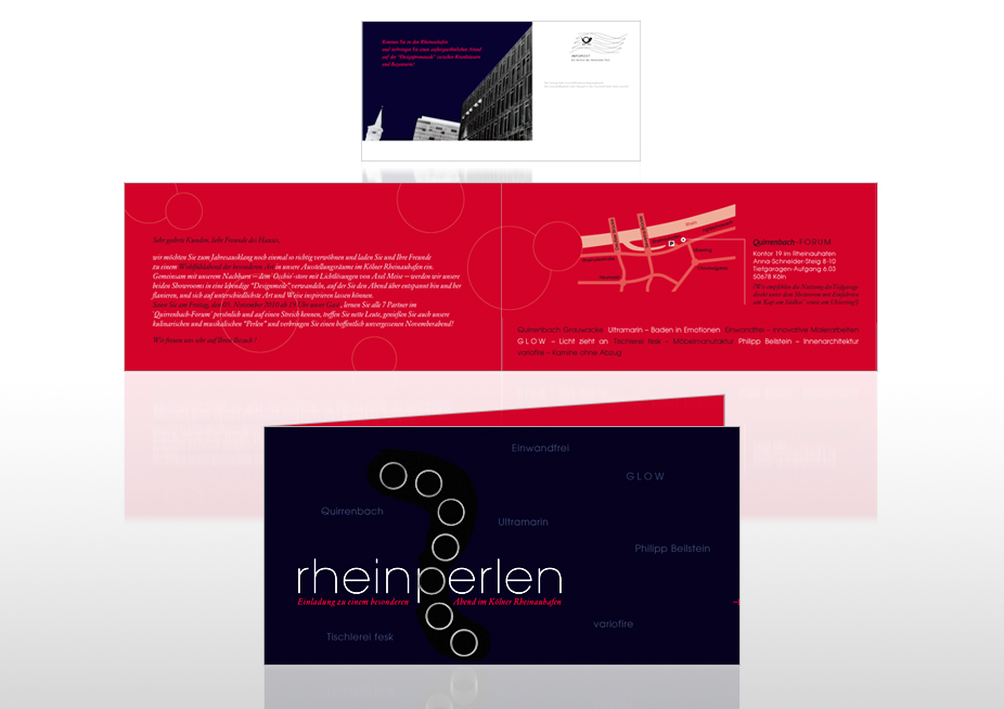 Gestaltung eines 4-seitigen DIN-lang Komplettmailers, Kunde: Quirrenbach-FORUM (Ausstellergemeinschaft aus dem Bereich Interior Design mit Showroom im Kölner Rheinauhafen)