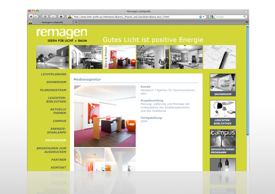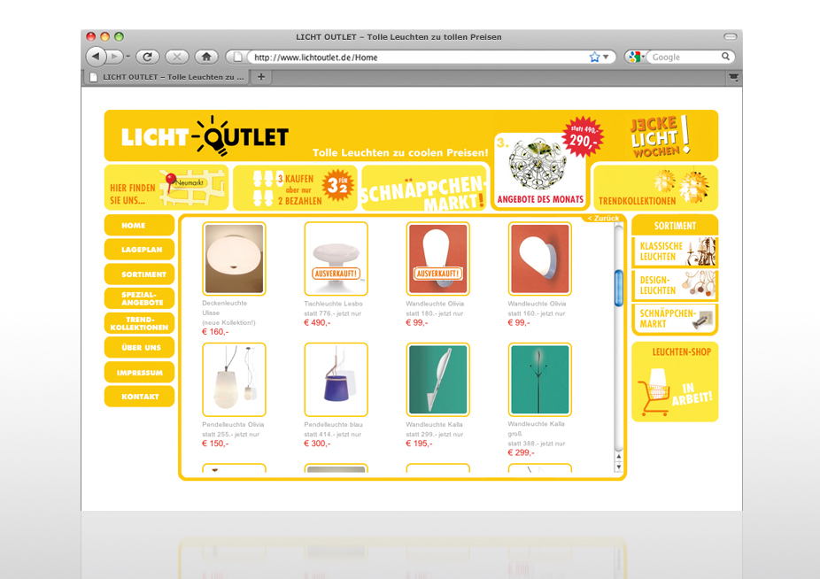Konzept und Gestaltung des Internet-Shops sowie redaktionelle CMS-Betreuung, hier: exemplarische Unterseite, Kunde: Licht-Outlet