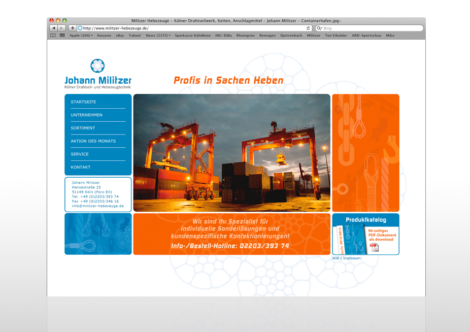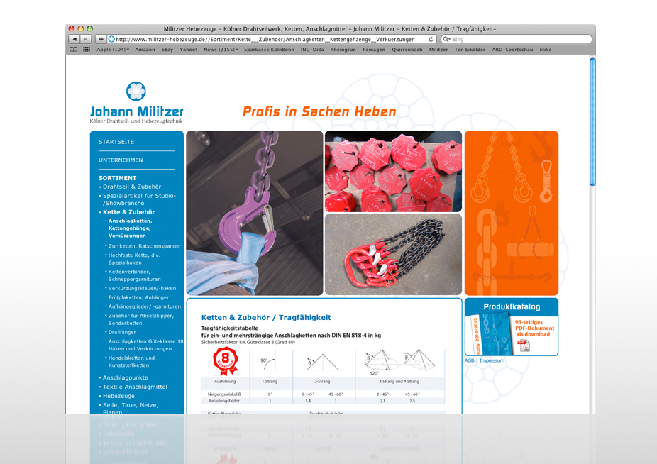 Konzept und Gestaltung des Internetauftritts incl. CMS-Betreuung, Ansicht: Exemplarische Unterseite, Kunde: Johann Militzer – Kölner Drahtseil- und Hebezeugtechnik