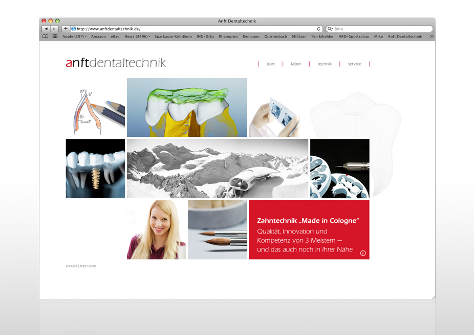 Konzept, Gestaltung und technische Umsetzung des Internetauftritts in ein CMS-System, Ansicht: Startseite, Kunde: Anft-Dentaltechnik
