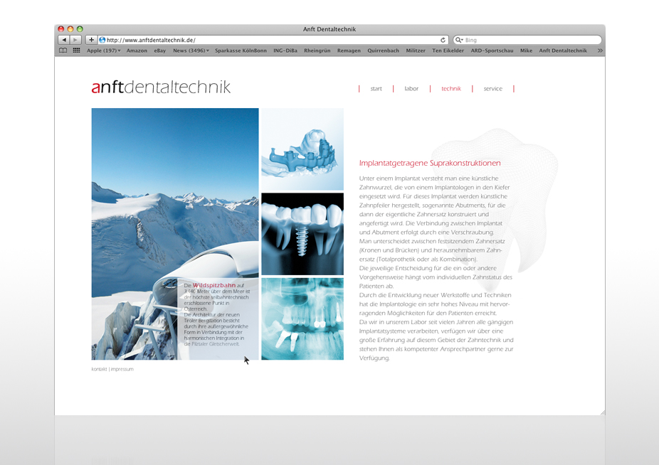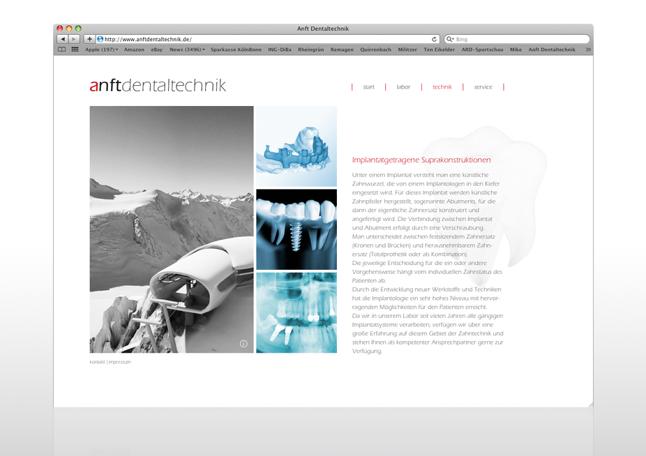 Konzept, Gestaltung und technische Umsetzung des Internetauftritts in ein CMS-System, Ansicht: Exemplarische Unterseite mit Mouseover-Effekt, Kunde: Anft-Dentaltechnik